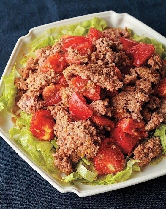 カフェの人気メニューも、おうちで楽しめます。料理研究家・大庭英子さんの家庭でつくるタコライス。細く切ったたっぷりのレタスと、色どり鮮やかなトマトにひき肉で、栄養満点!