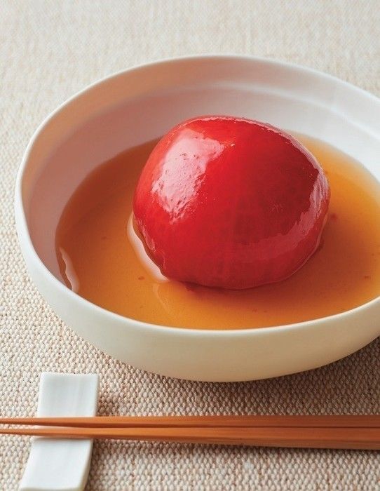 ゆでて皮をむいたトマトを、だし汁でひと煮立ちして冷蔵室で冷やします。味がしっかりしみて、おひたしはもちろん、オリーブ油を混ぜてドレッシングや、わかめをそえてあえ物などにも。アレンジ自由自在です!