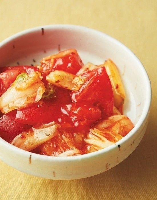 あと一品ほしいときや、ささっとつくれるおつまみはこちら。ひと口大にしたトマトとキムチ、しょうゆ、ごま油を混ぜるだけで完成。辛味と酸味の絶妙な相性で、お箸が止まりません。