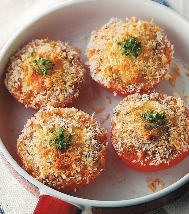 「トマトのグラタン」は、トマト自体をカップに見立ててつくるレシピ。見た目も華やかで、パーティー料理としてもおすすめです。なかにはハーブパン粉を入れてオーブンで焼きます。生ハーブを飾ると、よりおしゃれな見た目になりますよ。