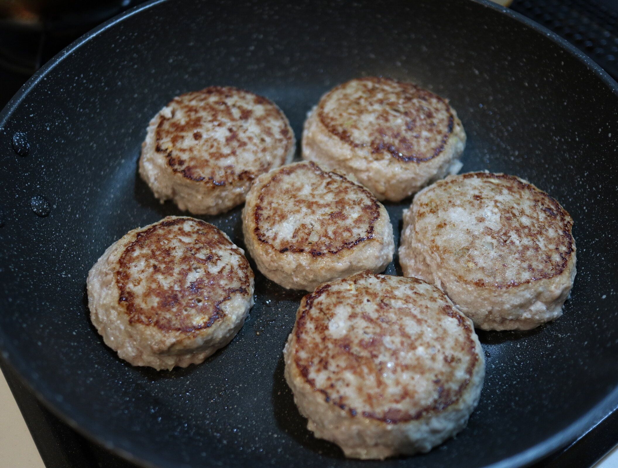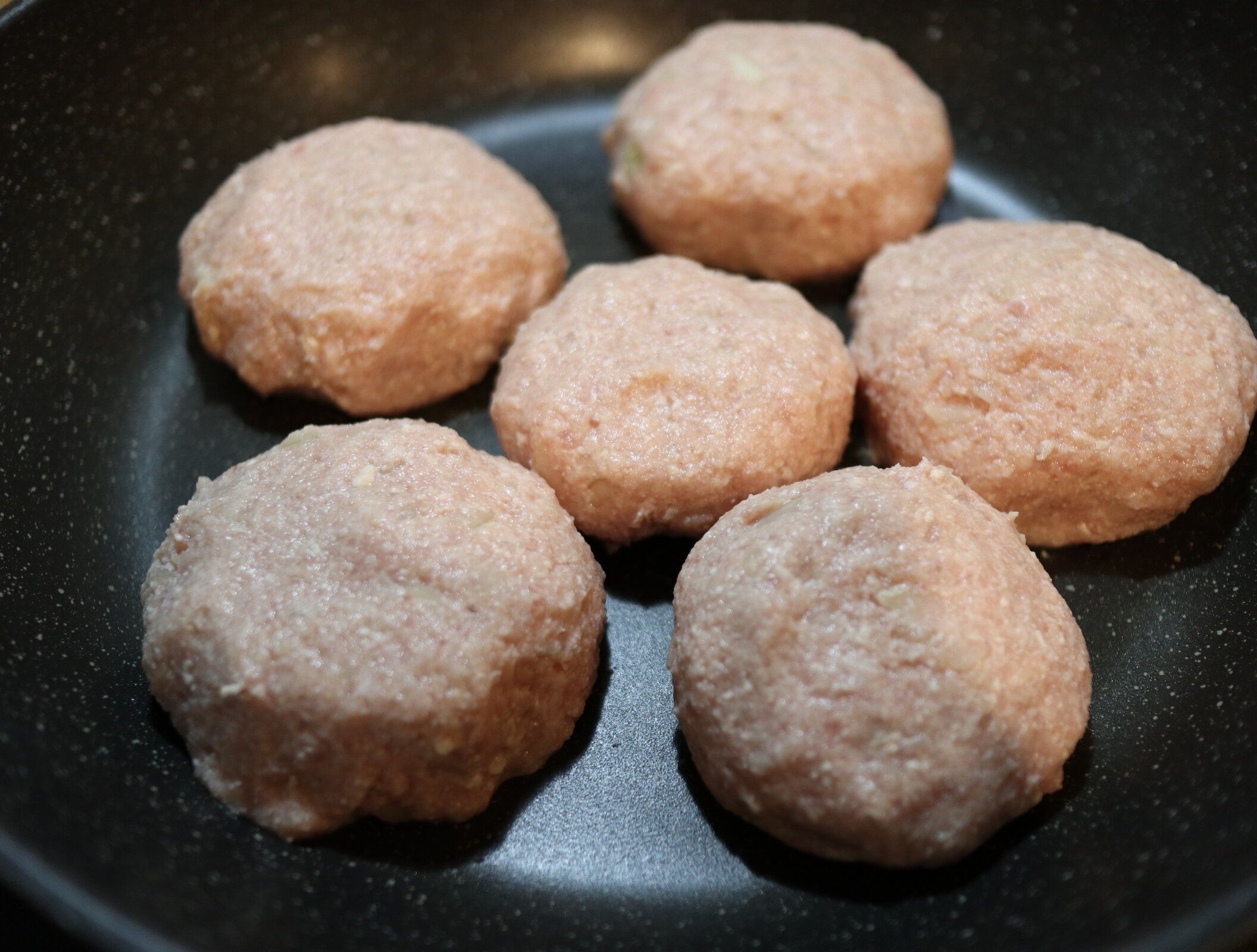 2.空気を抜きながら形を整え、温めたフライパンでしっかり焼き目がつくまで焼いていく。(お肉から油が出るので、油はひかなくても大丈夫です!)