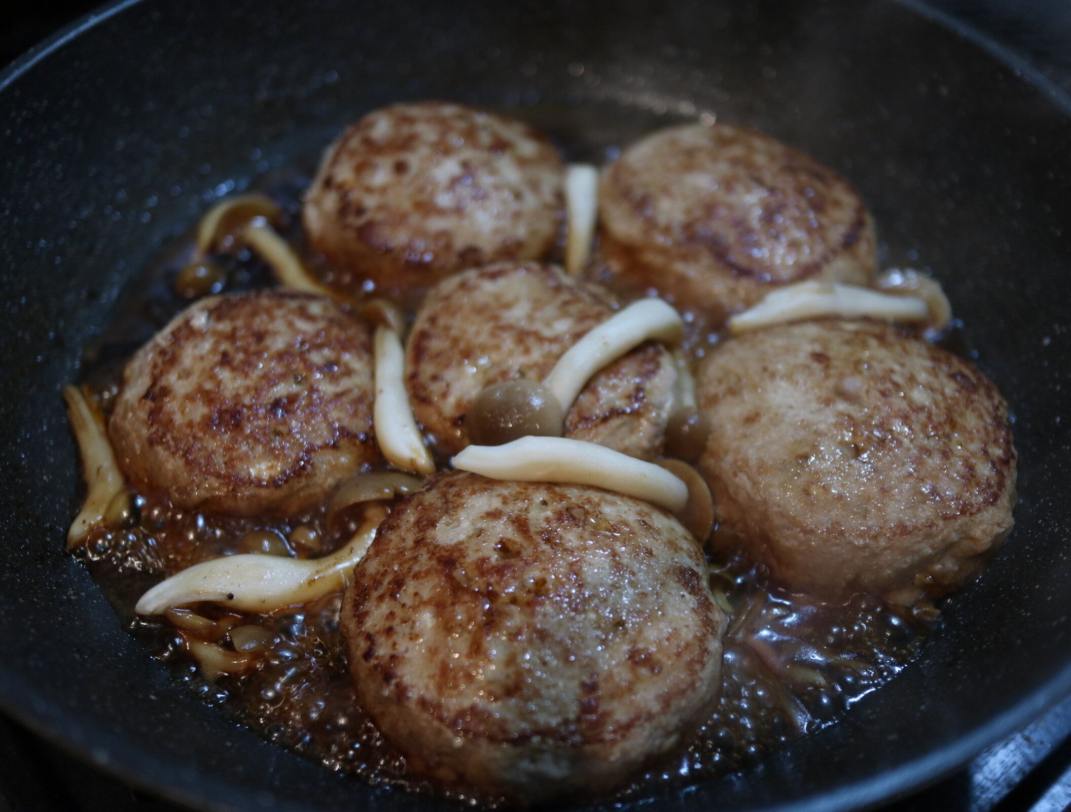 3.両面焼き色がついたら、ハンバーグの1/3の高さまで水を入れる。ほぐしたしめじ、★の調味料も入れ、ぐつぐつしたらフタをして5~10分中火で煮込む。