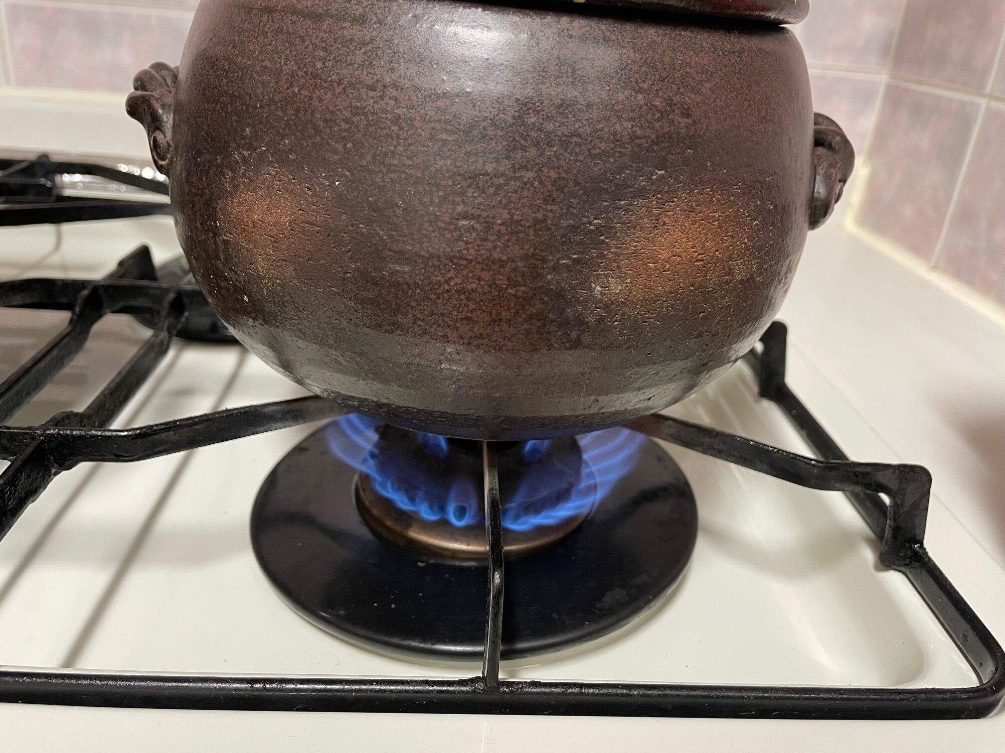浸水が終わったら火にかけます。土鍋からはみ出ない程度の中火から強火の間くらいの火にかけます。
