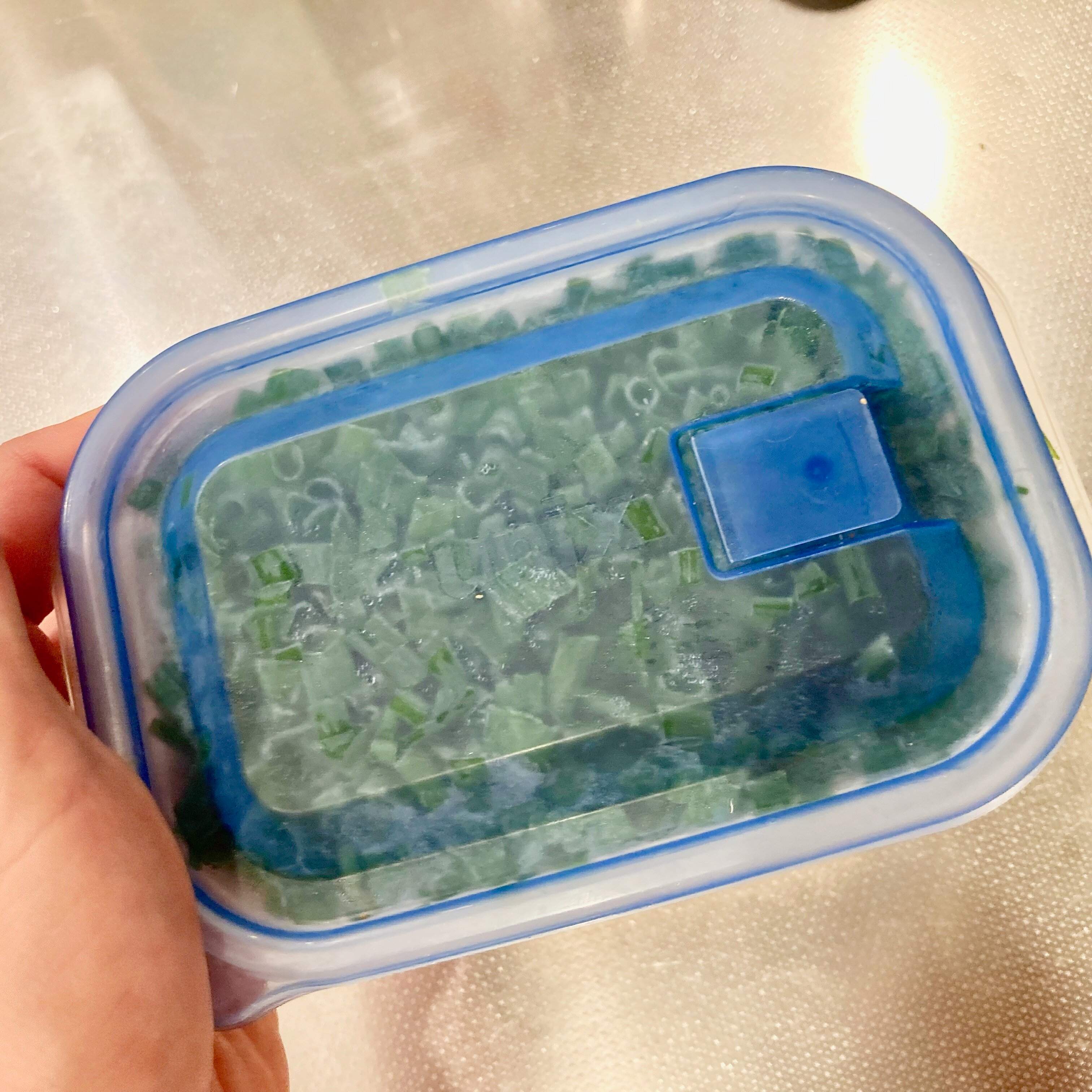 凍った小ネギのタッパーを出したら思いっきりシェイクしてください!