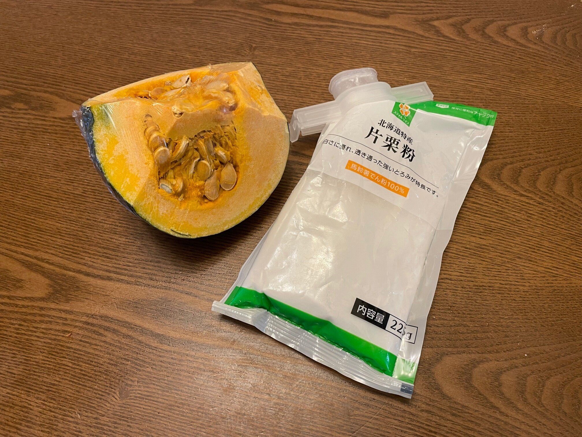 かぼちゃ団子の基本の材料は、「かぼちゃと片栗粉」この2つだけ!超シンプルです。味付けなども含めた材料と分量はこちらです。