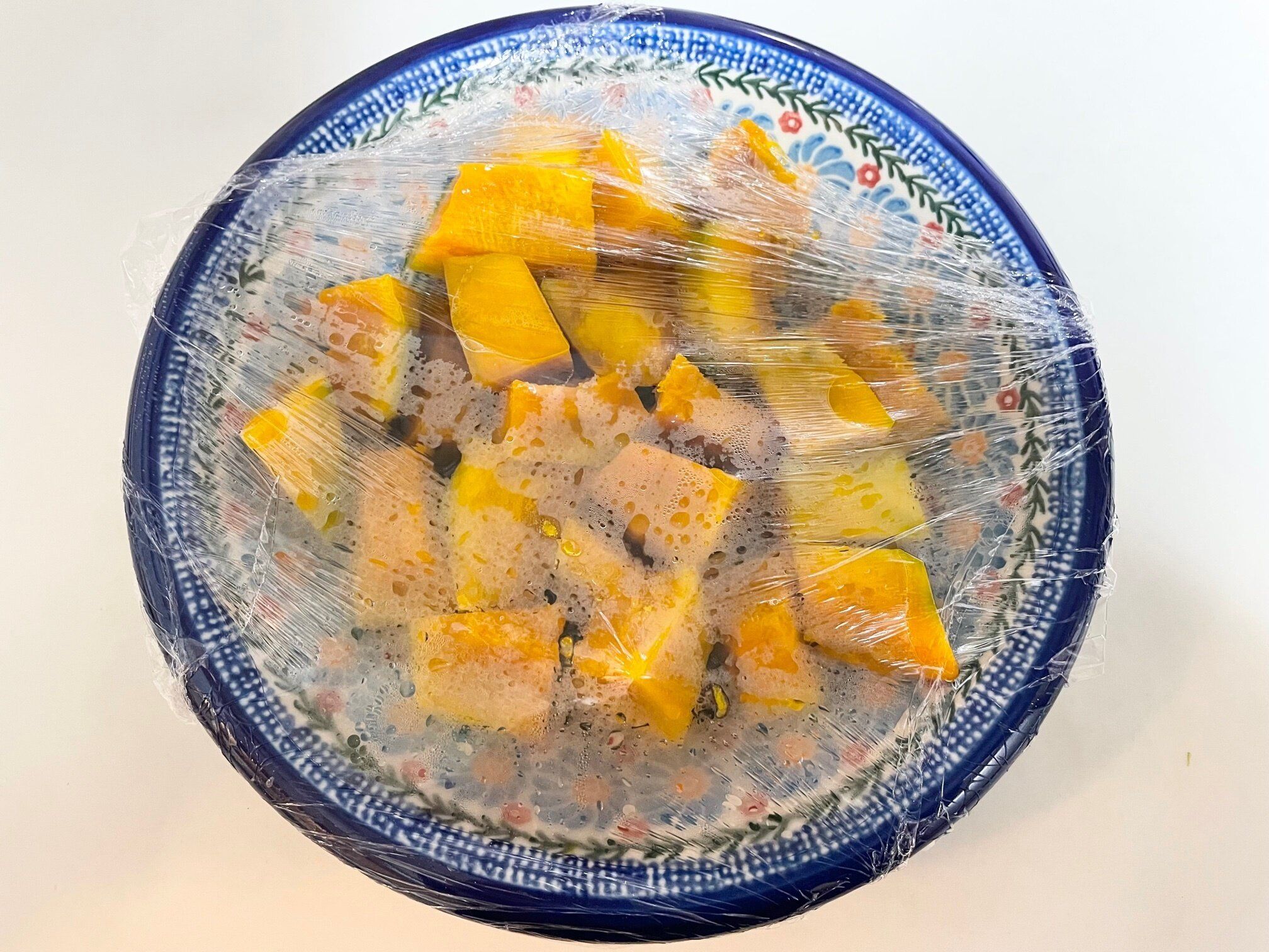 耐熱性の皿などにかぼちゃを広げて入れラップをかけて、600Wの電子レンジで5分ほど加熱してかぼちゃに火を通します。