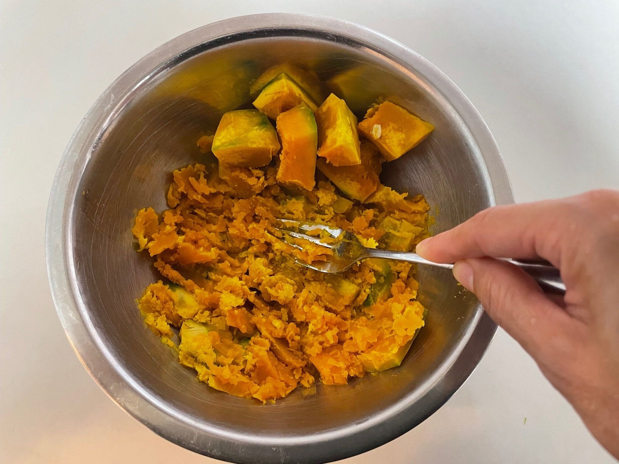 かぼちゃをボウルなどへ移し、フォークやマッシャーでよく潰します。