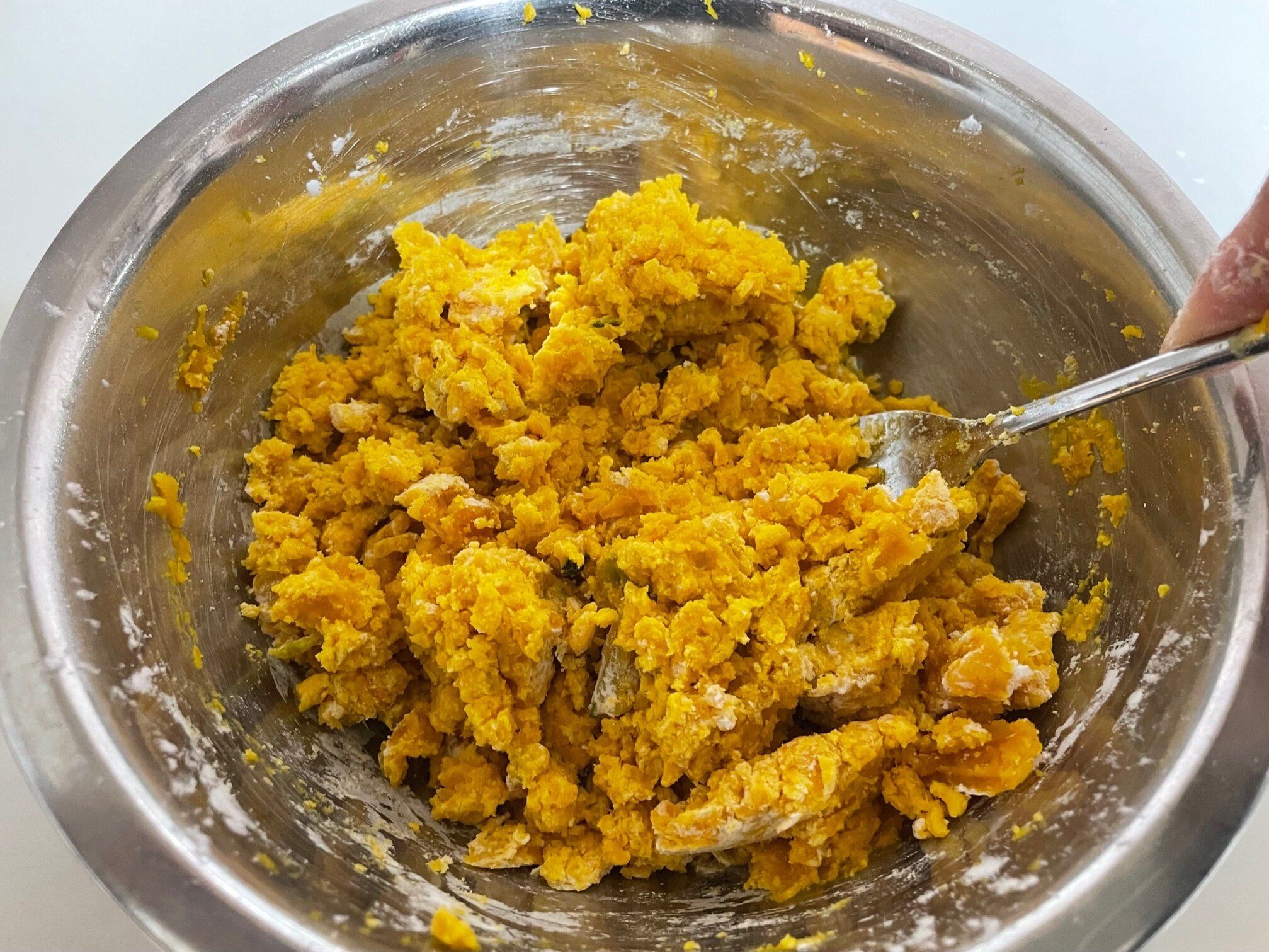 かぼちゃが潰れたら片栗粉大さじ4を入れます。最初はフォークなどで混ぜ、片栗粉がなじんだら手で少しこねて全体をまとめます。