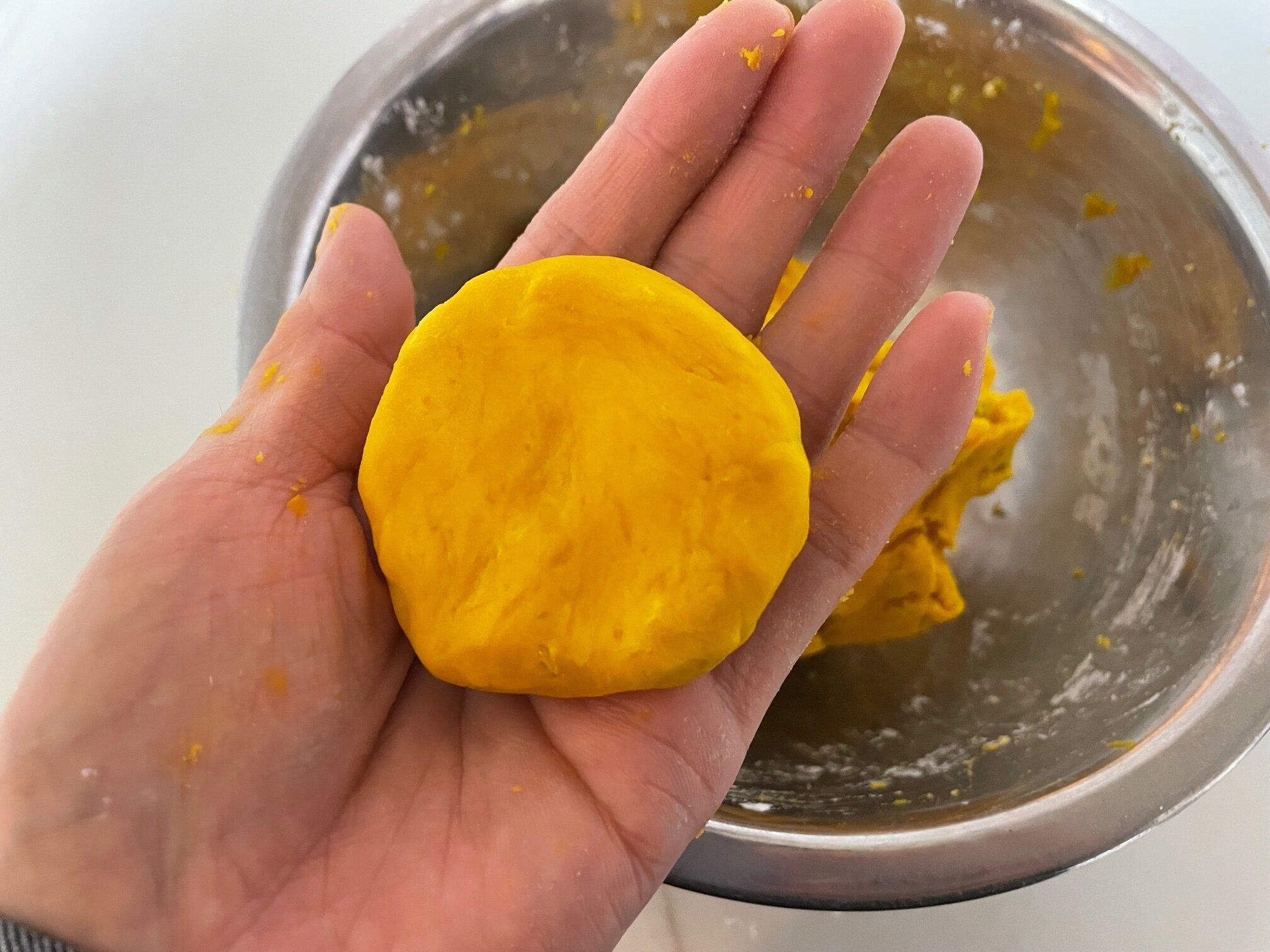 片栗粉とかぼちゃがよく馴染んでまとまったら、厚さ1cm直径4~5cmくらいの形にしていきます。