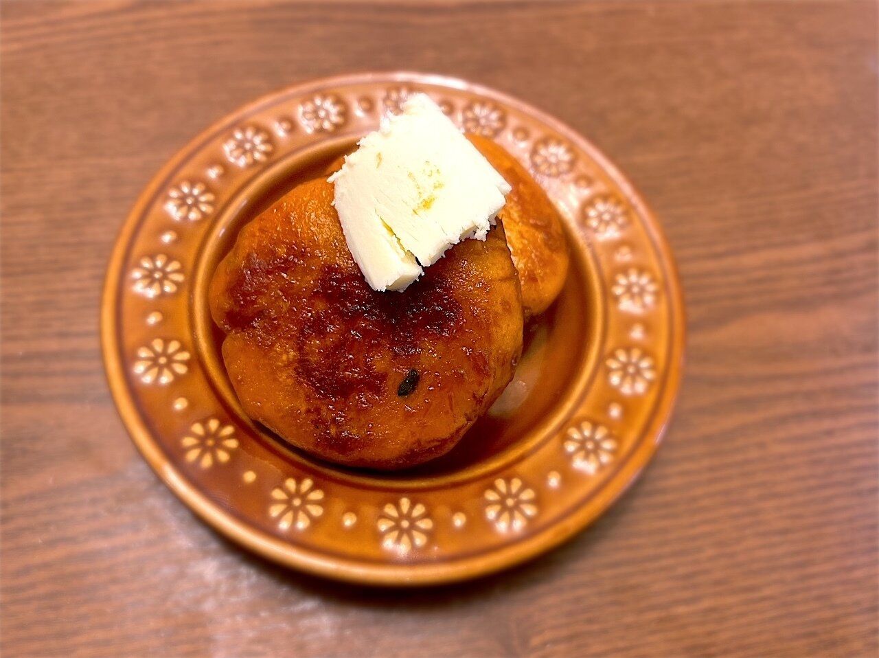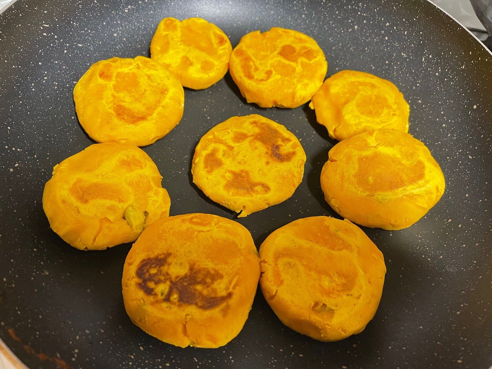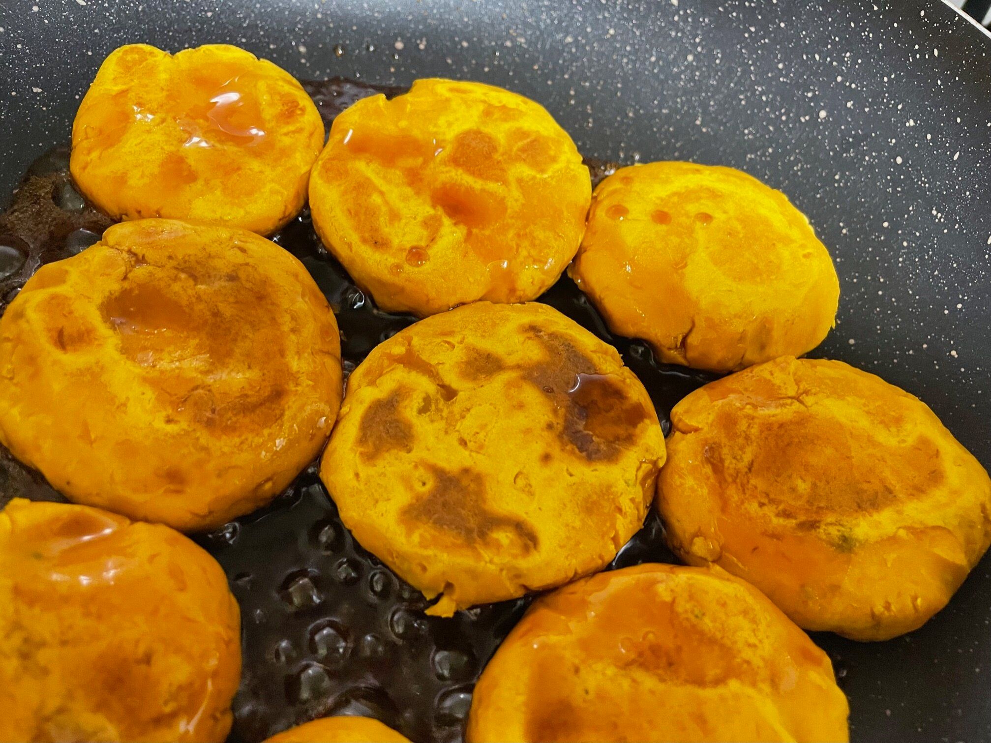 フライパンに軽く油をひき、弱めの中火くらいで焼いていきます。途中でひっくり返しながら、かぼちゃ団子の色か濃くなり軽く焦げ目がつくくらい5分程度焼きます。