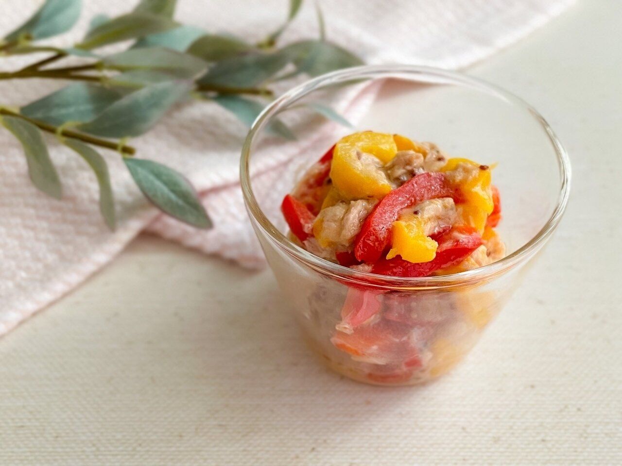 スライスしたパプリカとツナ缶、調味料を和えるだけ。粒マスタードの辛みがアクセントになり、そのまま食べてもパンにのせてもおいしく召し上がれます。