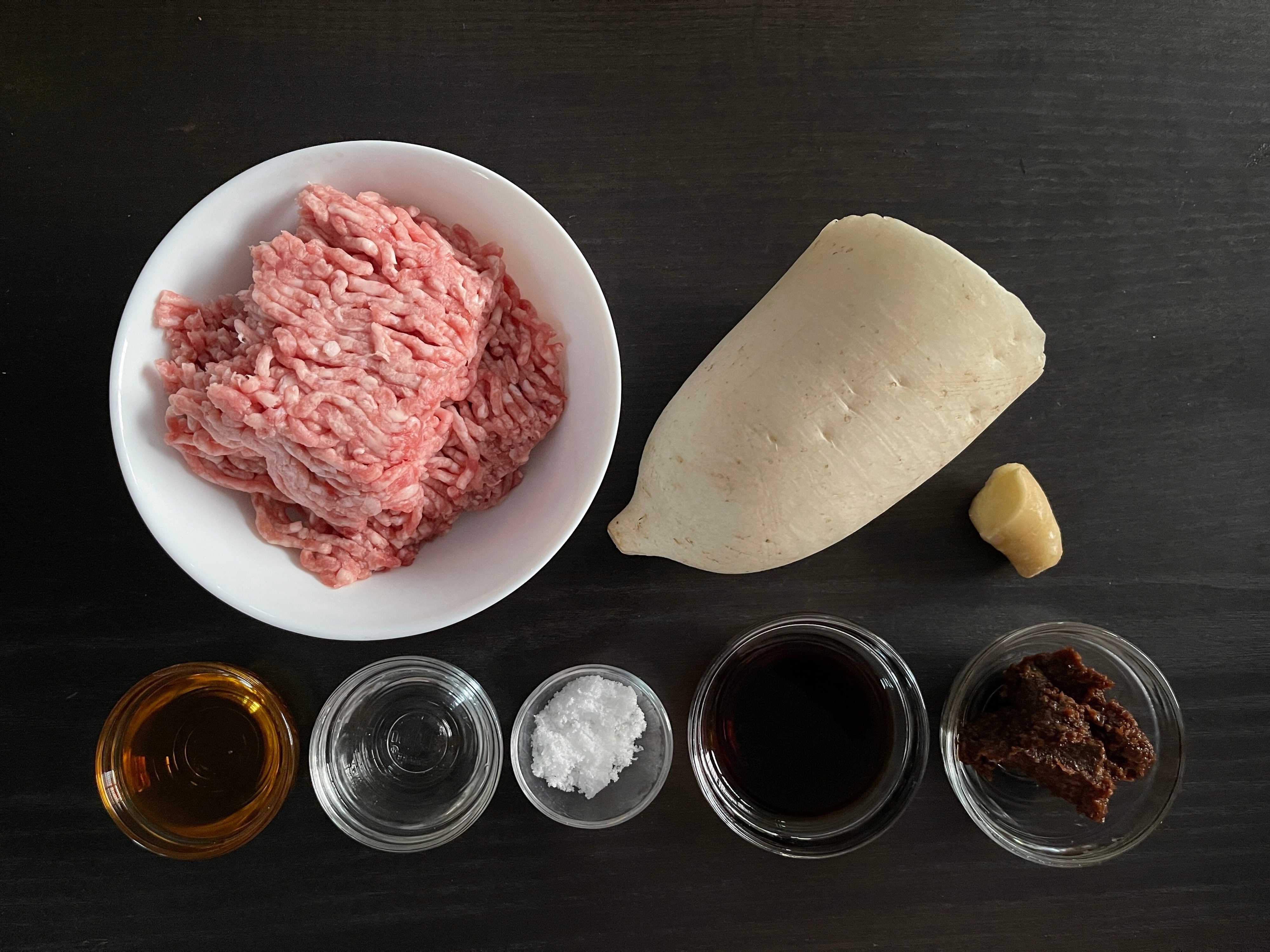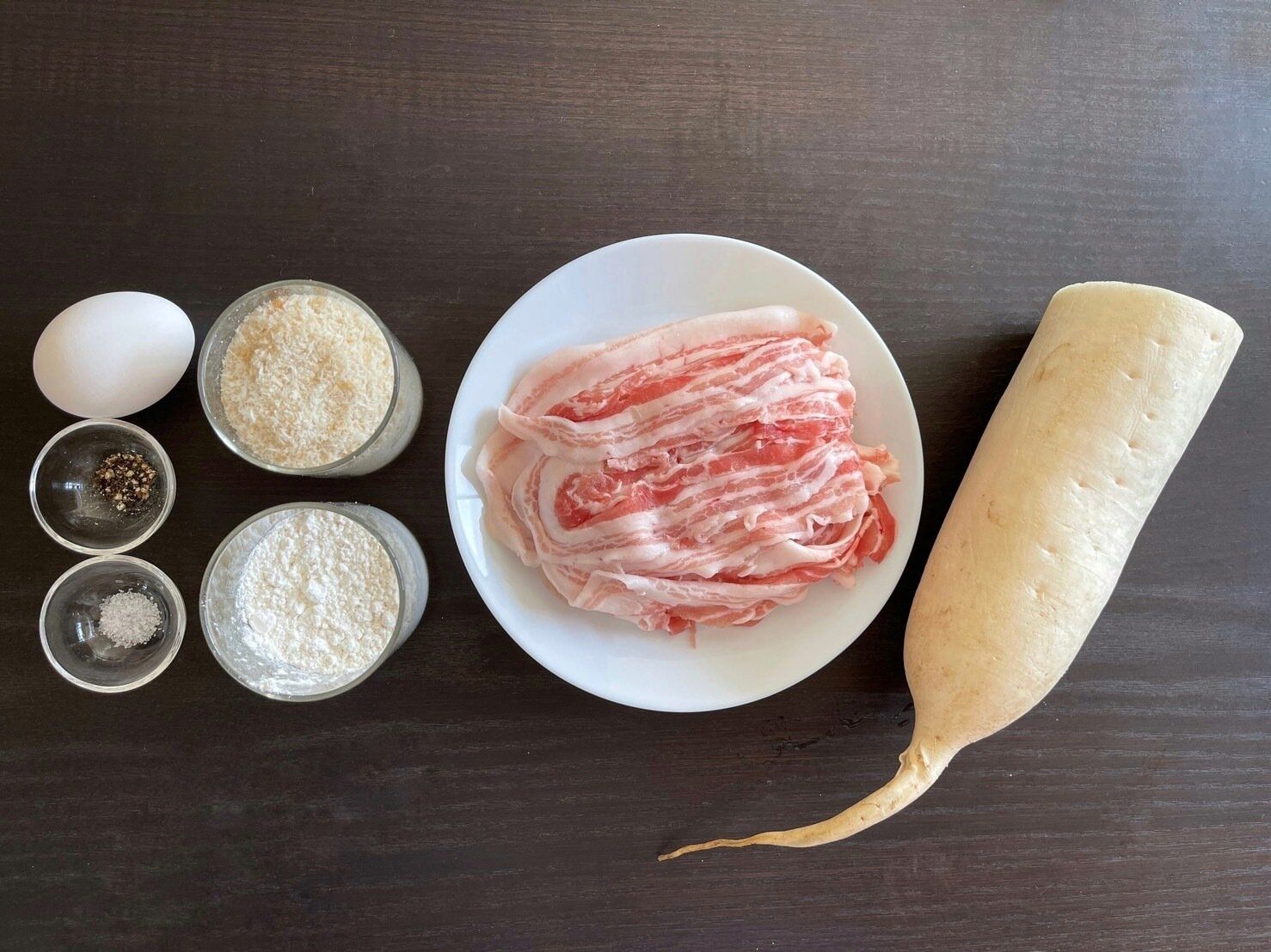大根に豚肉をまきつけてかさ増しする、大根とんかつのレシピです。