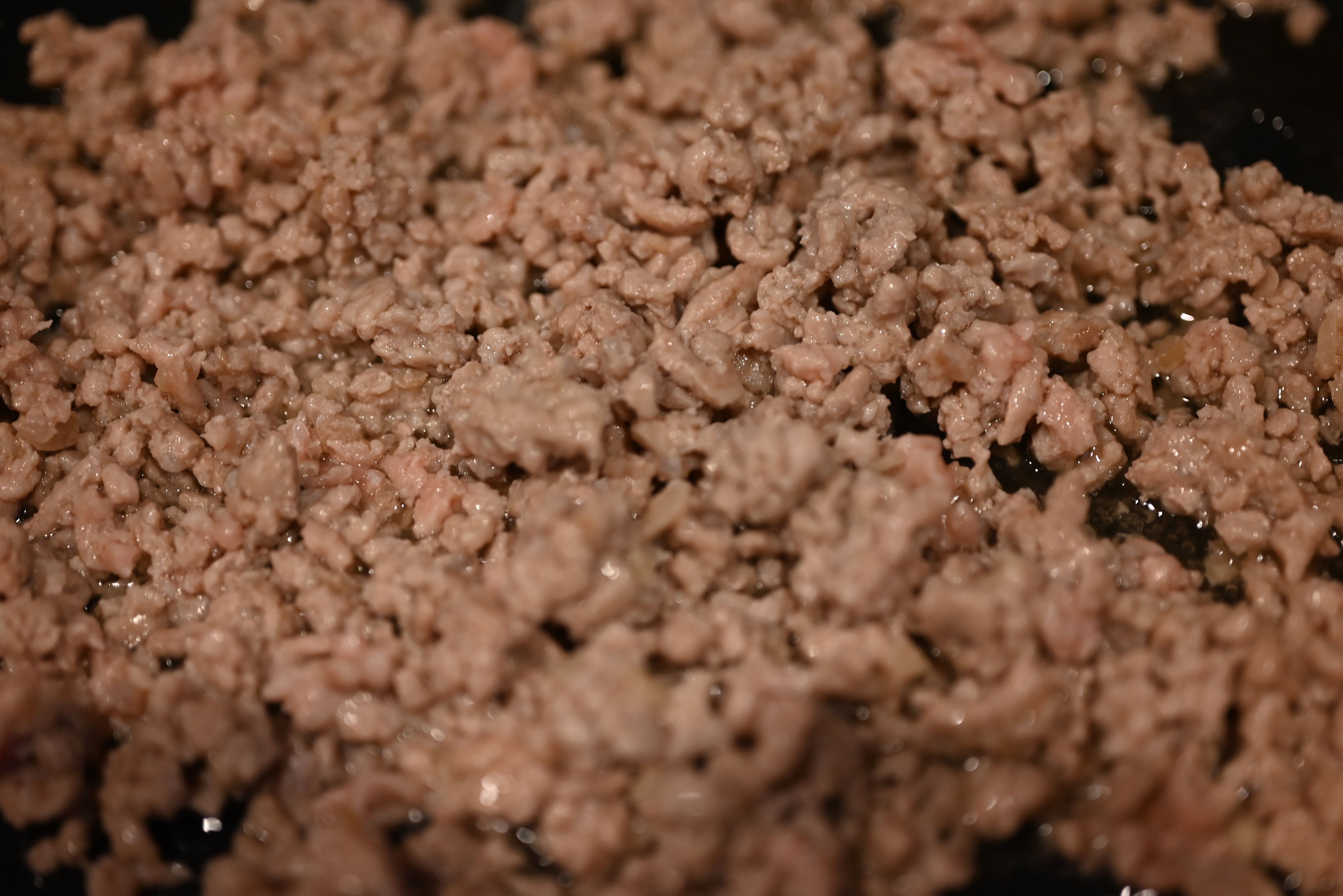 香りが出てきたら、ひき肉を加えて中火にして炒める。