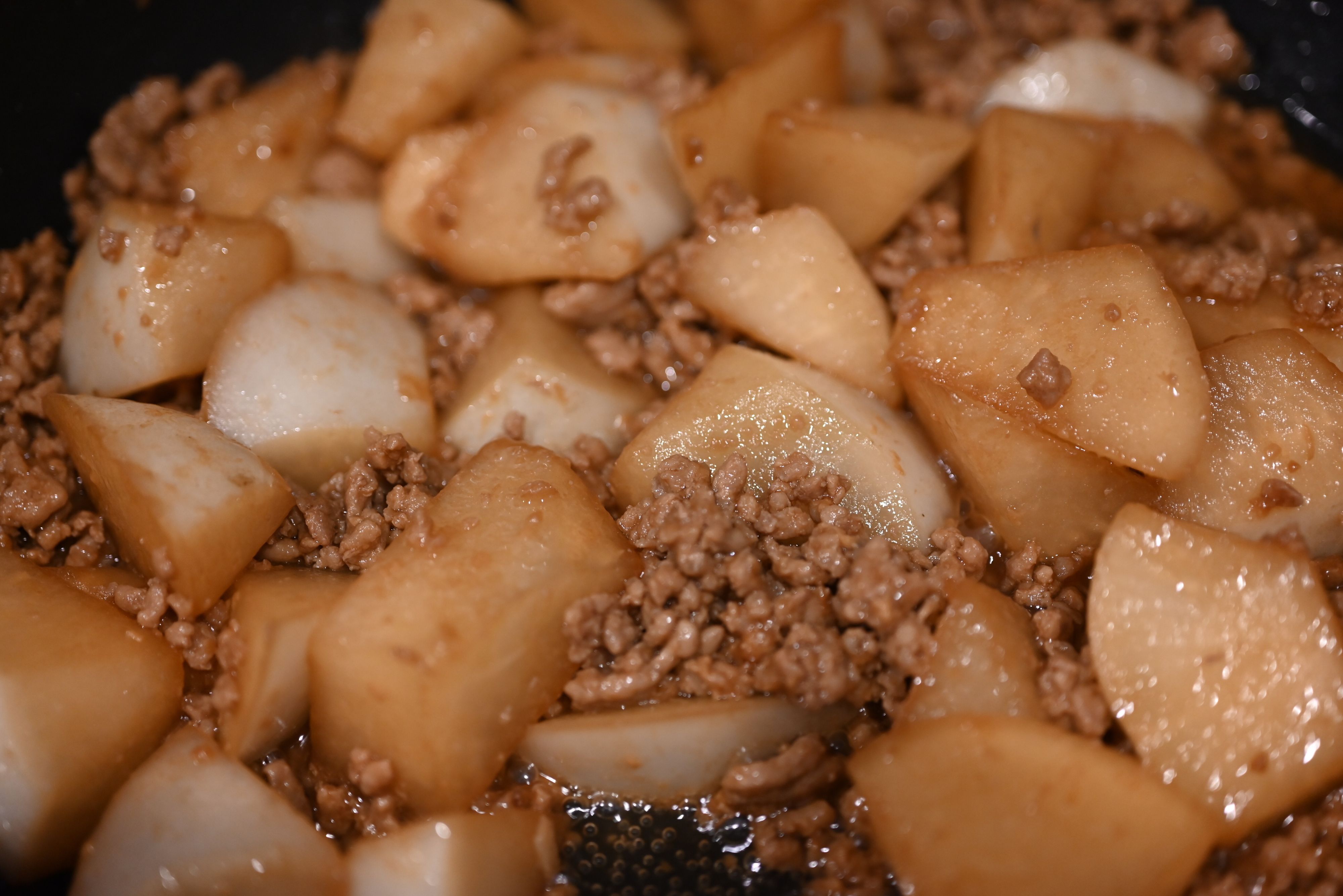 大根と豚ひき肉を合わせた、大根とひき肉の甘辛炒めのレシピです。大根をレンジ加熱してから炒めることで、加熱時間を大幅に短縮したひと品。