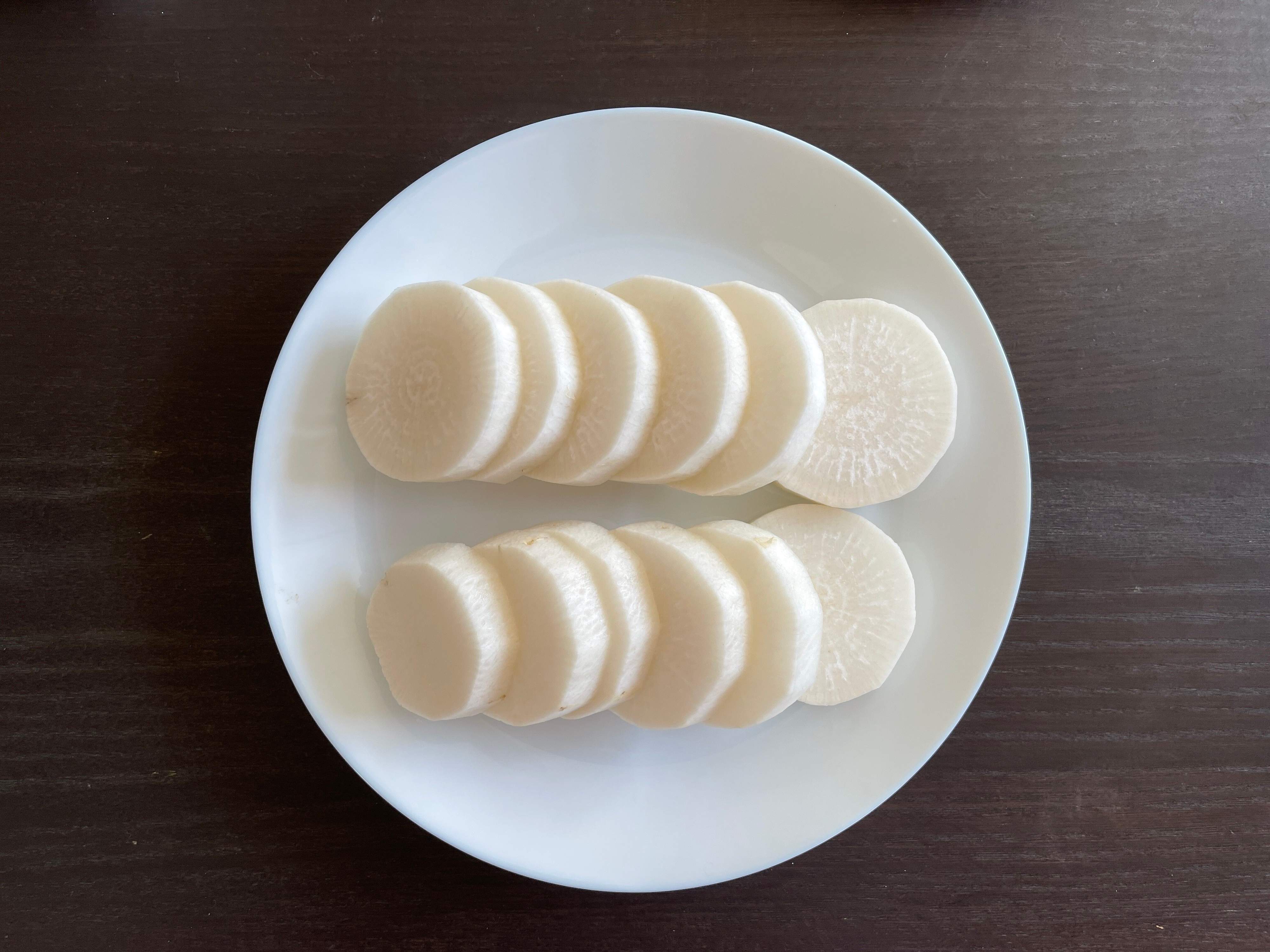 水を大根がかぶるまで入れてラップをし、600wで6分ほど加熱してザルに上げる。