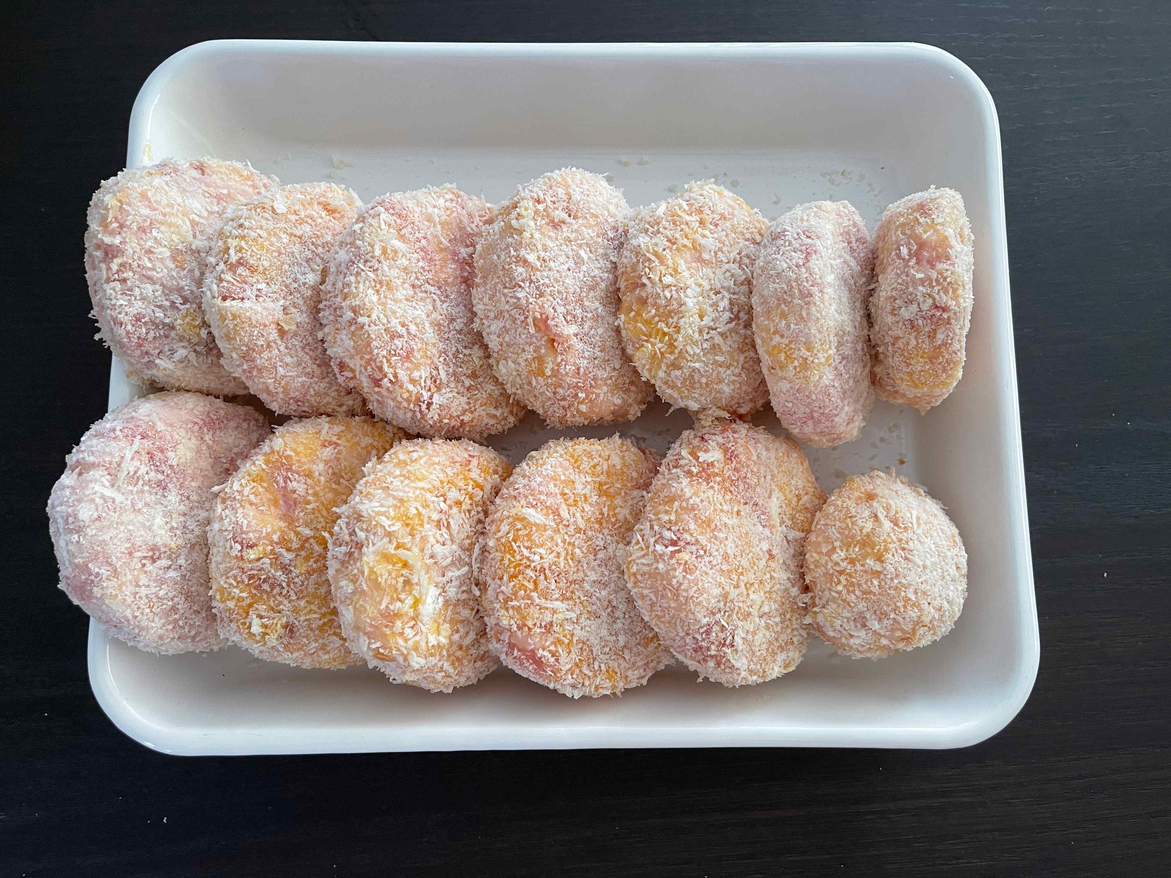 (3)(2)に小麦粉、卵、パン粉を順番にからめていく。