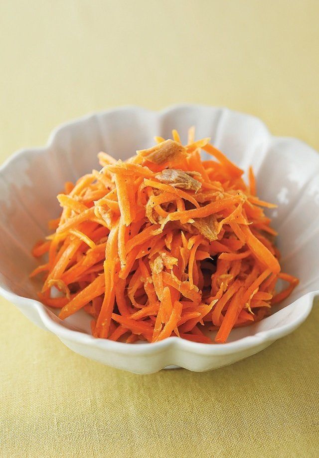 (1) にんじんは、スライサーなどで細切りにする。