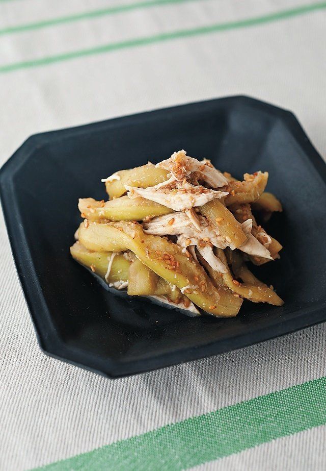 (1)なすはへたを除いてピーラーで皮をむき、さっと水にくぐらせて1 個ずつペーパータオルで包み、さらにラップで包む。耐熱皿に並べて電子レンジで3分加熱する。鶏肉は耐熱皿にのせてAをふり、ふんわりラップを掛けて電子レンジで2分加熱する。ともに粗熱が取れたら、手で裂く。