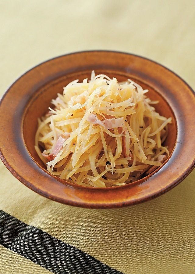 (1)じゃがいもは、皮をむいてピーラーなどでせん切りにし、水にさらして水けをしっかりきる。ベーコンは、幅5㎜に切る。