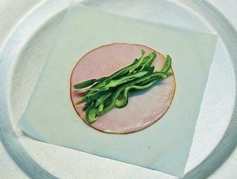 1.春巻きの皮(小)は角が正面にくるように置き、真ん中より少し手前に具を横長にのせる。