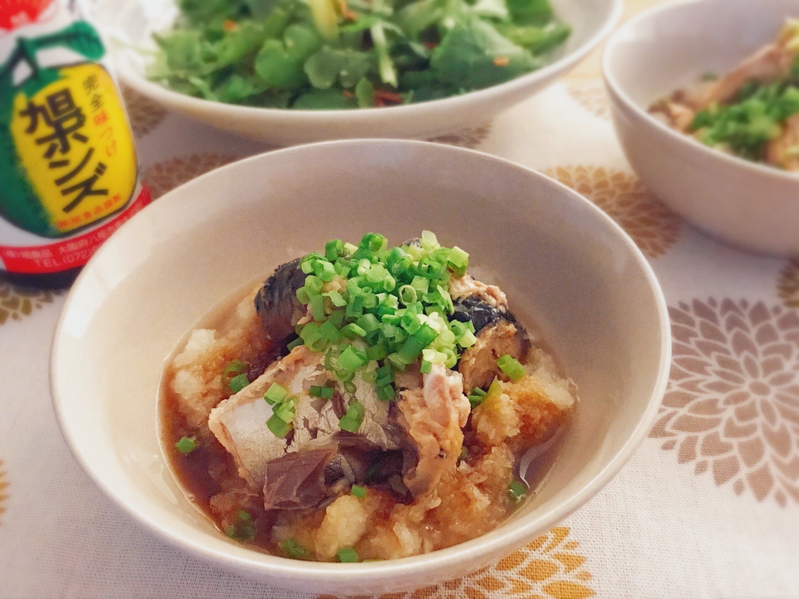 たっぷりの大根おろしにさば缶(水煮)をのせて、ポン酢をかけるだけ。