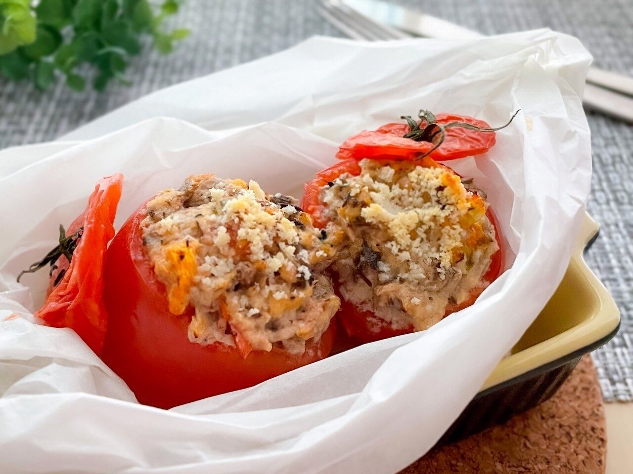 くりぬいたトマトの中にさば缶(水煮)とトマトを混ぜたものを入れて焼く、ファルシーという詰め物のレシピです。チーズをのせて焼いてもおいしいですよ。