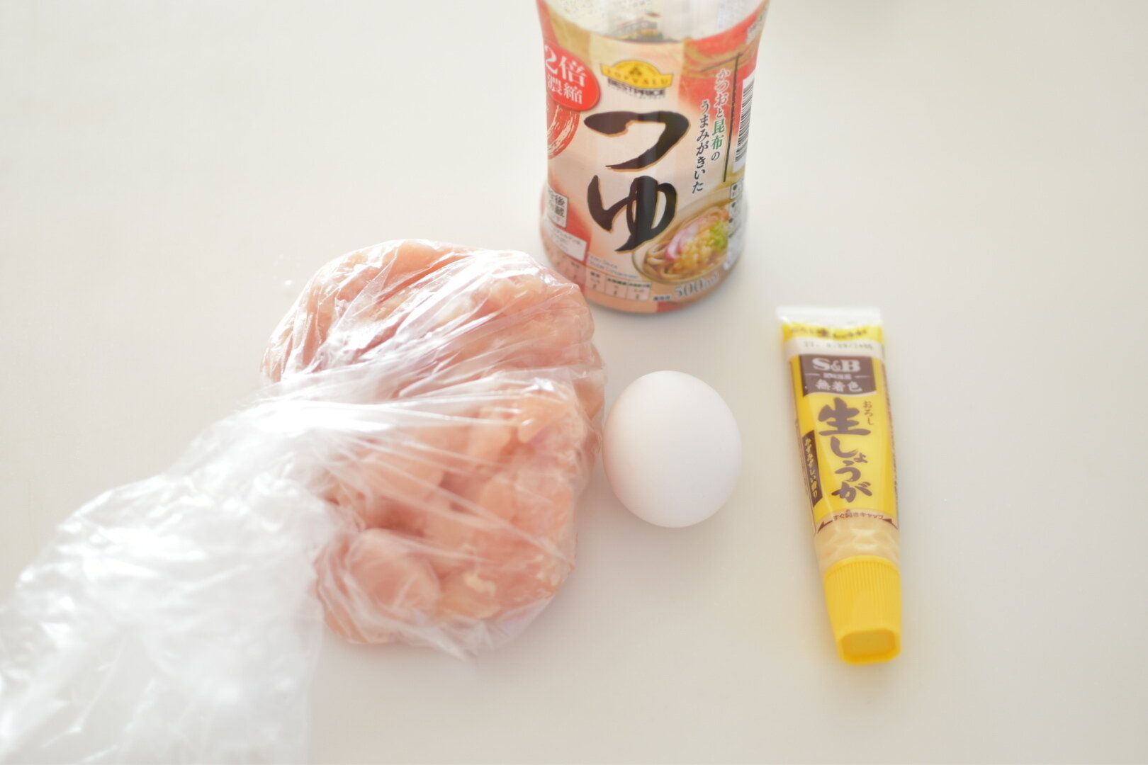 鶏むね肉、片栗粉、卵、めんつゆ、しょうが、塩こしょう