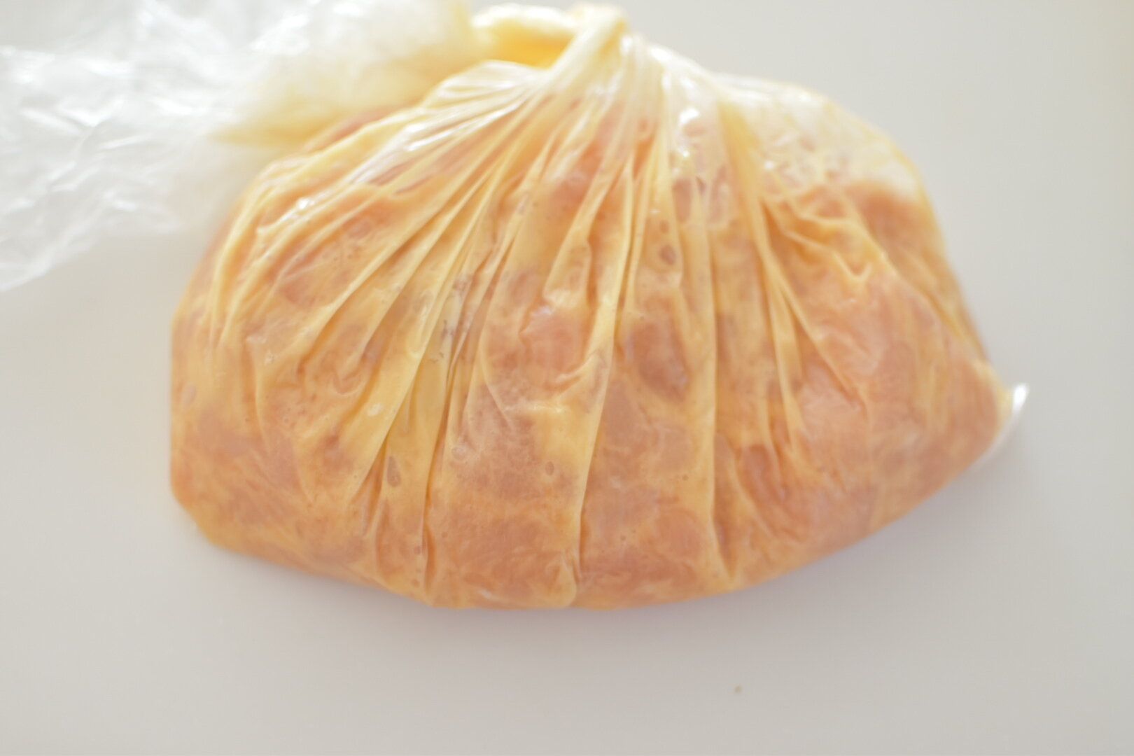 2.ポリ袋に鶏むね肉に入れたら卵、塩こしょう、めんつゆを適量混ぜて、片栗粉を全体がトロッとするまで加えます。
