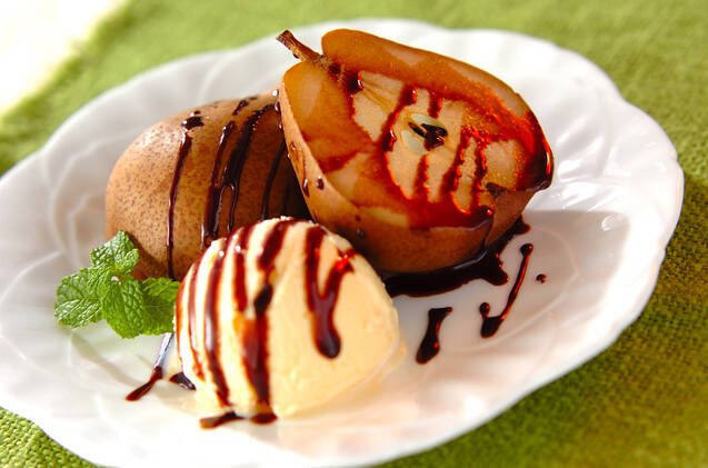 ラ・フランスをまるごと使ったオーブン焼きのレシピ。バニラアイスやチョコレートシロップ、ミントの葉を添えておしゃれなワンプレートに仕上げます。柔らか&アツアツのラ・フランスと、ひんやりアイスのメリハリを楽しめそうです!