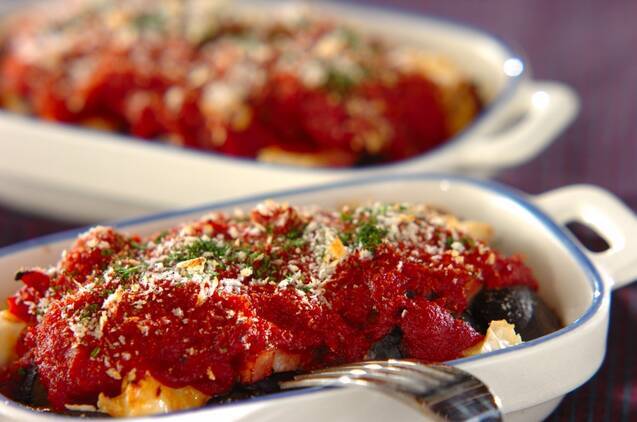 ナス、トマト、チーズの相性ばっちりのおいしさを堪能できそうな、オーブン焼きのレシピです。洋食の副菜にいかがでしょうか。細かく刻んだアンチョビも、味のアクセントになりそうですね!