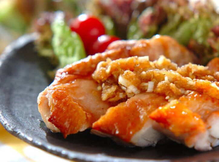 オーブンでパリッと焼いた鶏もも肉に、大根や玉ねぎなどを使ったおろしダレをかけていただくおろしダレがけ塩焼き鶏。さっぱりとした味わいで、和食のメインのおかずにもおすすめです。レタスやトマトを添えると彩りもアップします!