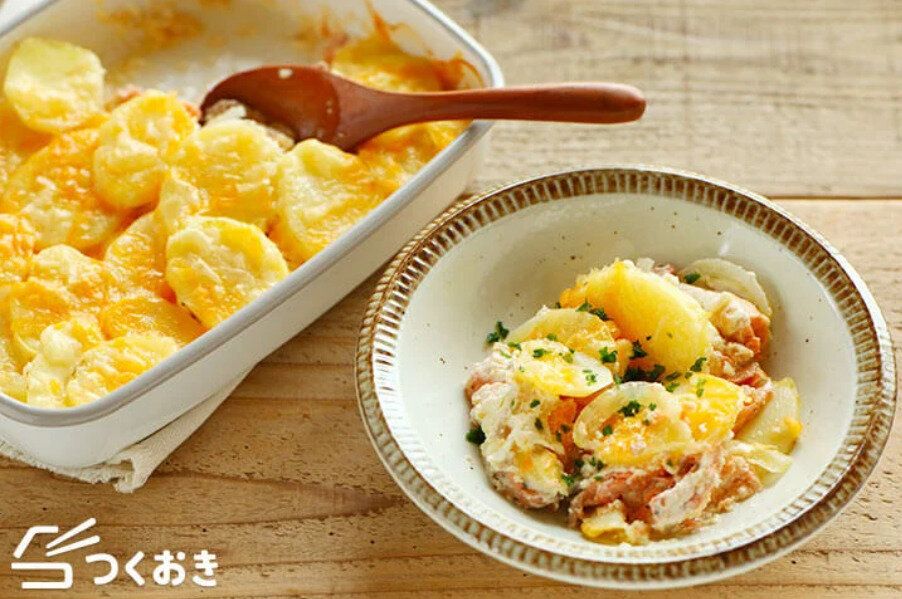 相性ばっちりの鮭とポテトのグラタンレシピ。マヨネーズや牛乳、チーズなどを使ってとろっとクリーミーに仕上げます。耐熱容器に材料を入れてオーブンで焼くだけの手軽さで、お弁当やメインのおかずにも◎です!