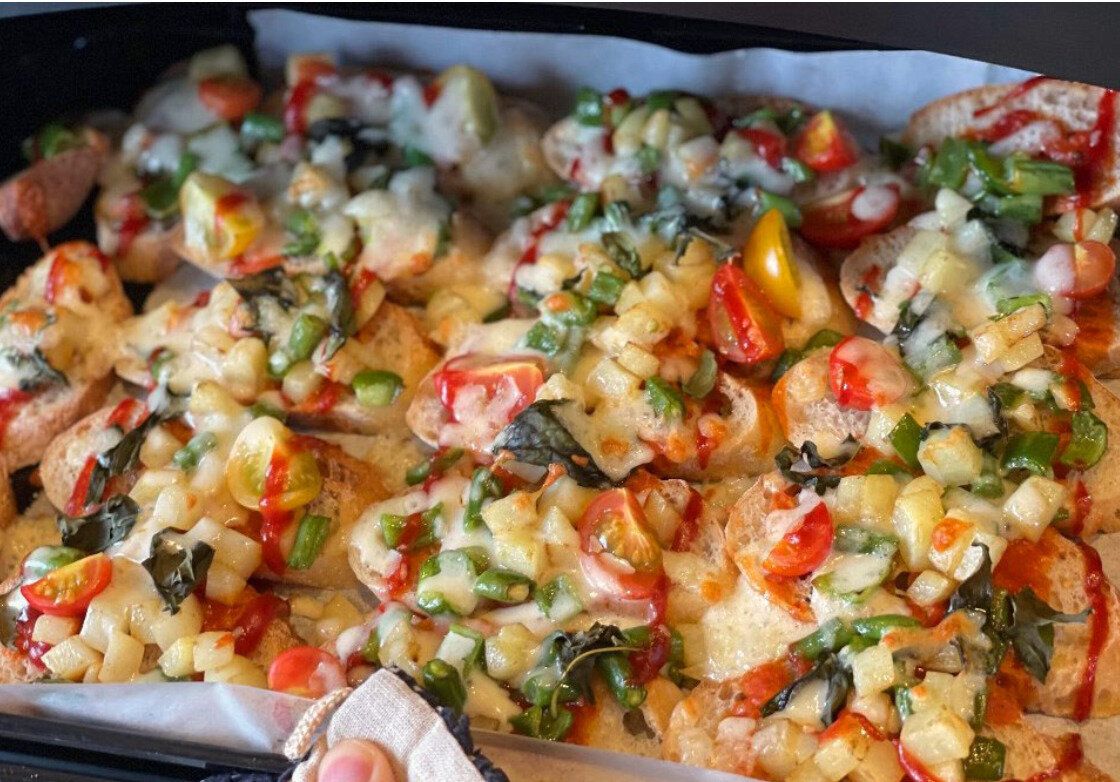 具材たっぷりで彩り豊かなお手軽ピザトーストのレシピ。バゲットなど食べ応えのあるパンを隙間なく並べるのがコツで、パン屋さんで購入したバゲットを使うのもおすすめです!ボリュームたっぷりで食べ応えがありますよ。