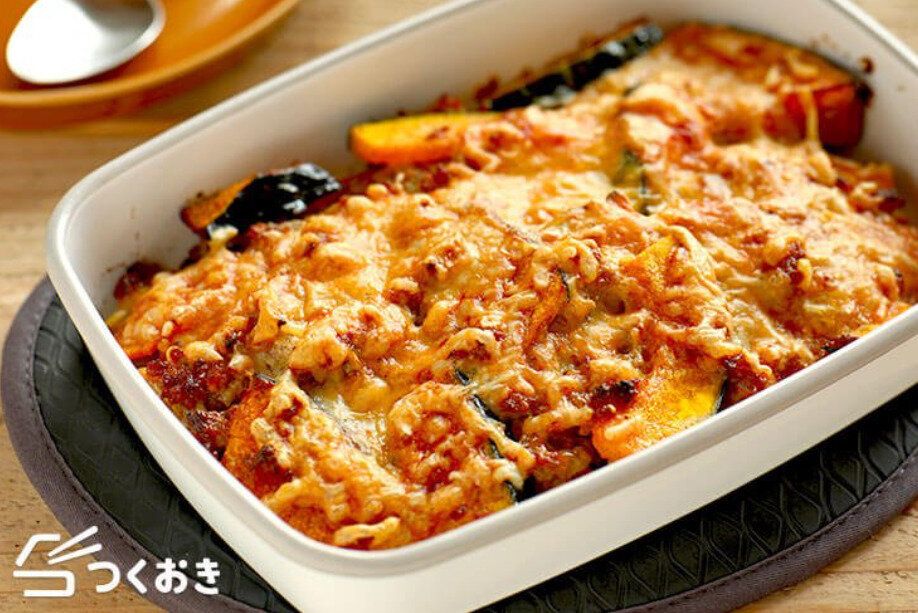 「かぼちゃとひき肉のマヨグラタン」は、かぼちゃとひき肉などでつくるグラタンです。マヨソースを加えることで、コクが増します。オーブンで10分ほど焼いて完成!冷蔵で4日ほどもちますよ。