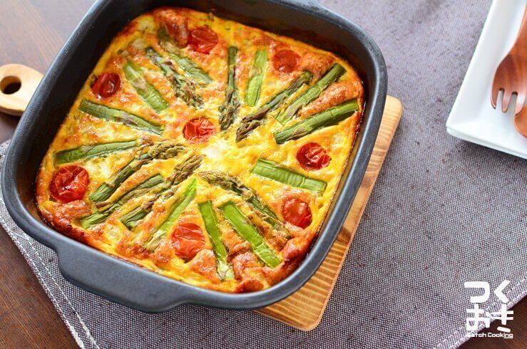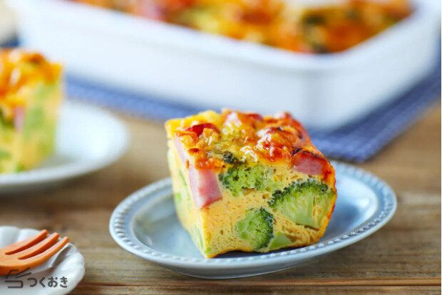 食材を耐熱皿に入れてオーブンで焼くオープンオムレツのレシピです。耐熱皿にクッキングシートを敷くことで、取り出しやすくなり手洗いが簡単に!朝食やお弁当のおかずとして活躍すること間違いなしです。