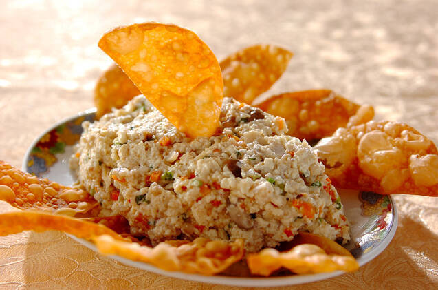 パリパリ食感の揚げ餃子といっしょに、おつまみ感覚で食べられる中華白和え。にんじん入りで、いろどりも華やかです。中華のメインに合わせる前菜・副菜にもぴったりですよ。