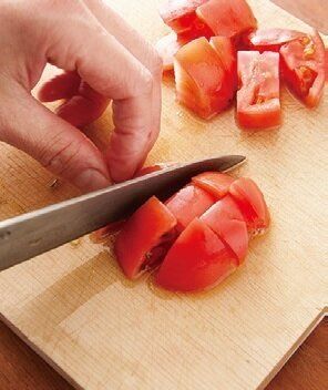 トマトをさっと混ぜると炒めものもさっぱり。ひき肉と一緒に食べやすいように小さく切る。縦半分に切ってから縦と横に幅2cmに切る。
