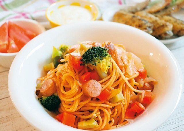 野菜スープの具を多めに取り分けておき、夕食はパスタをたして野菜たっぷりナポリタンにアレンジ。これで朝晩、野菜がしっかりとれます。