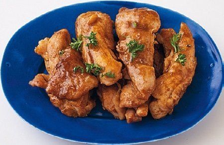 幅2㎝ の棒状に切った鶏もも肉を両面各4分焼き、上の調味料を入れてからめる。あればパセリ適量をのせる。