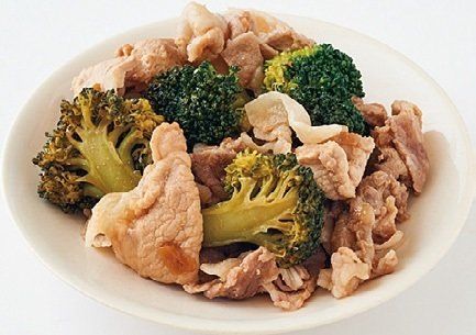 豚こま切れ肉と小房に分けたブロッコリー1/3個分を5分ほど炒め、上の調味料を入れて炒め合わせる。