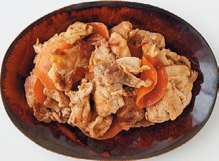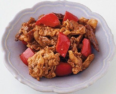 豚こま切れ肉と2 ~ 3㎝ 四方に切ったパプリカ(赤)1/2個分を5分ほど炒め、上の調味料を入れて炒め合わせる。