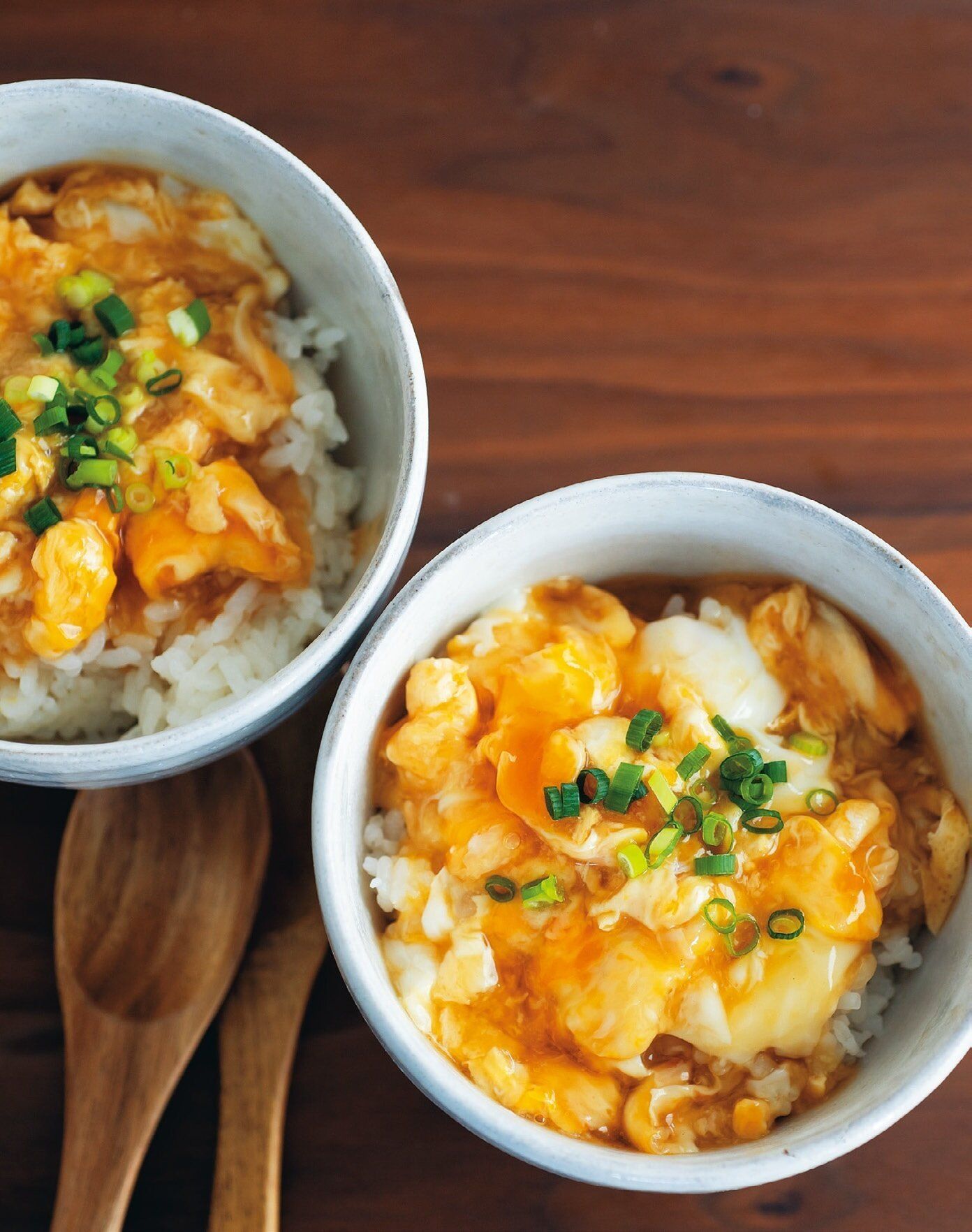 卵は軽く溶きほぐす。卵液を流し入れたらフライパンの底から3~4回混ぜる。卵が固まってきたら軽く混ぜて、ご飯にかけて、好みで万能ねぎをのせる。