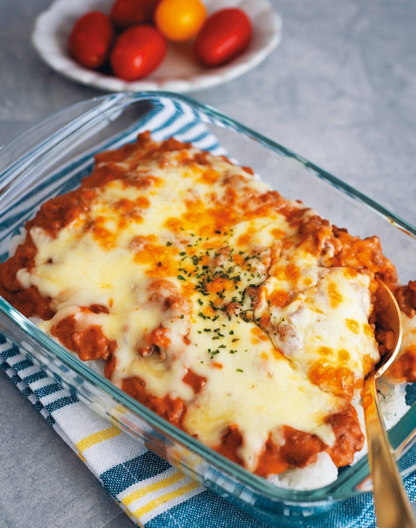耐熱容器にご飯を盛り、(1)をかける。チーズをのせて、オーブントースターで焼き目がつくまで焼く。あればドライパセリをふる。
