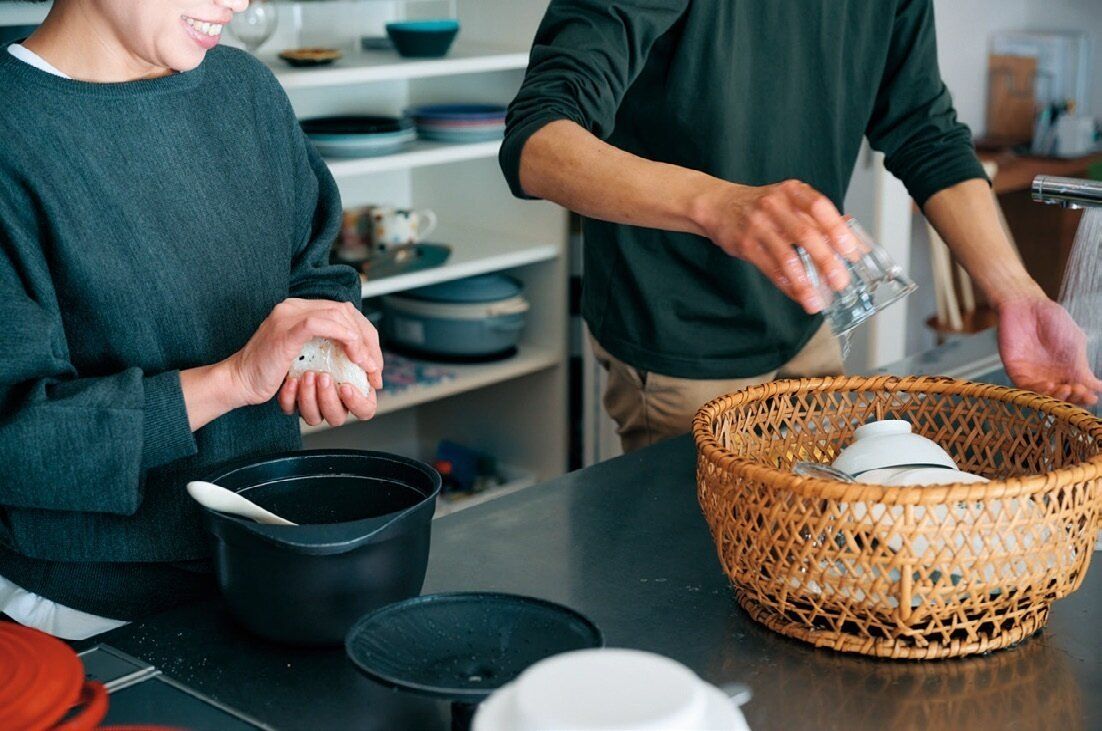 「相手が何かやっていたら自分も一緒にやり、早く終わらせて2人でゆっくりする」がはなさんと夫の基本スタンス。だから、夕食後は夫が食器を片づけ、はなさんは翌朝用のおにぎりを握って家事を同時進行で片づけます。