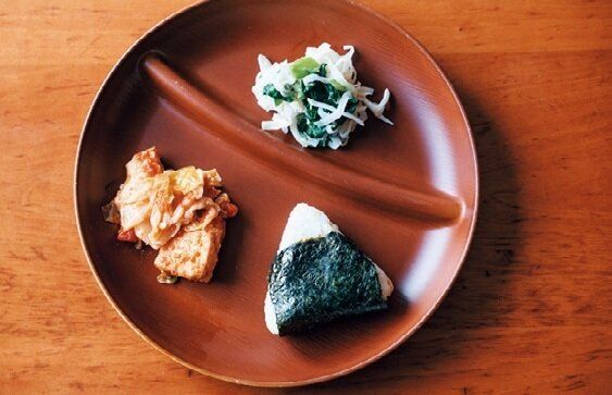 前夜に握っておいたおにぎりと、残り物をのせたワンプレートごはんが定番。軽くて丈夫、食洗機OKのニトリのプレートを愛用中。