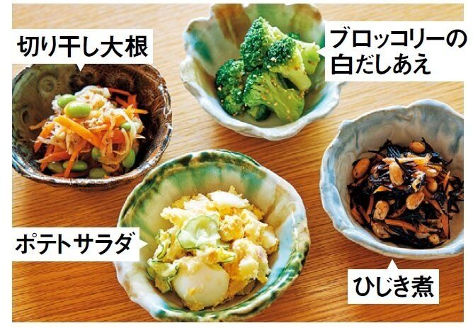 いろいろな副菜を作っても子どもが食べてくれないので、人気の4品(切り干し大根、ブロッコリーの白だしあえ、ポテトサラダ、ひじき煮)をローテ。切り干し大根にはツナを加え、食べやすくアレンジ。ひじき煮が余ったら、おにぎりや卵焼きの具にして食べ切ります。