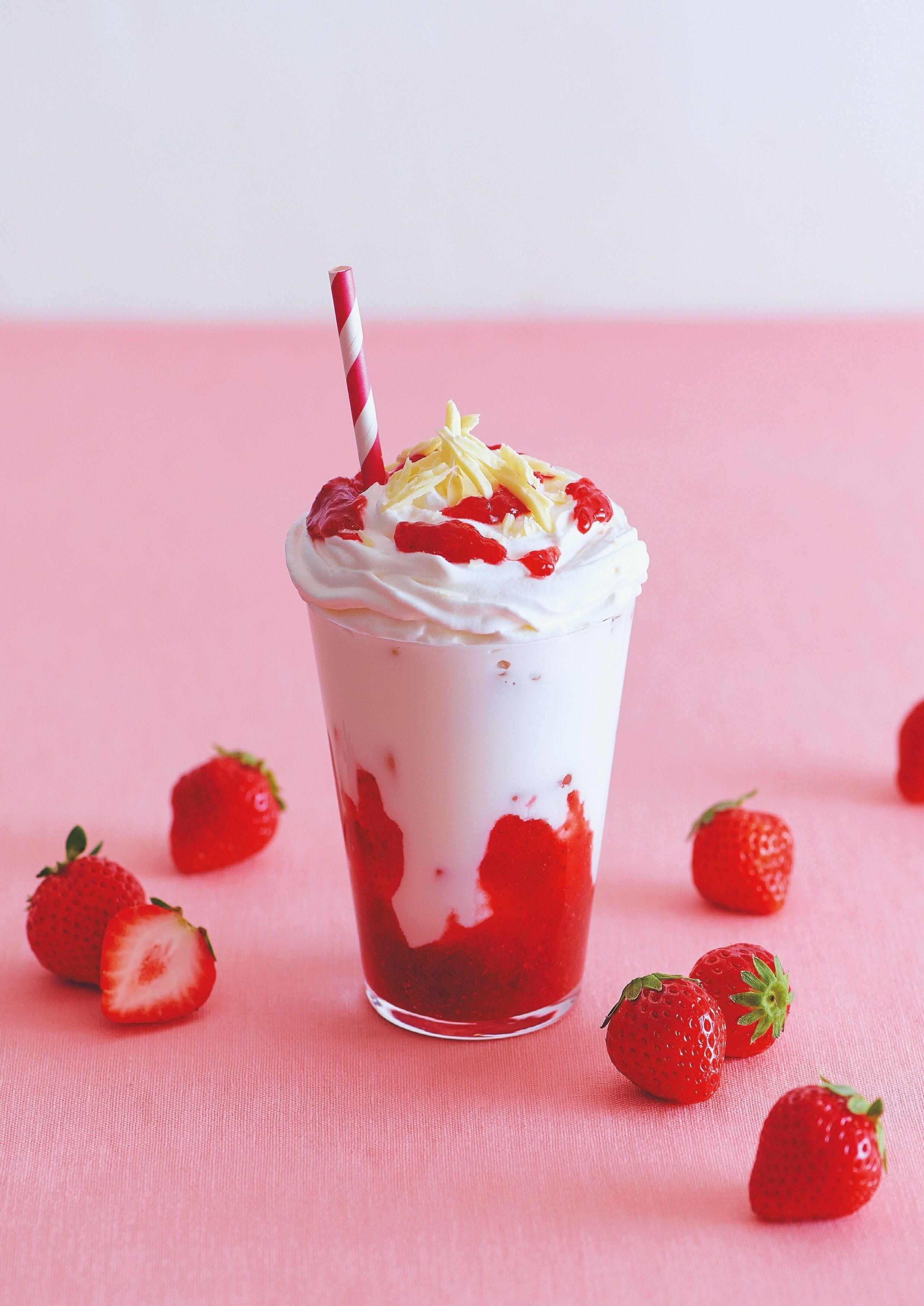 某コーヒー専門店の人気メニュー「フラペチーノ」がヒントの映え系いちごミルク。レンチンで作った即席いちごソースと、ぱらっと散らしたホワイトチョコが見た目と味のアクセントに。生クリームの代わりにバニラアイスクリームをのせるのもおすすめです。