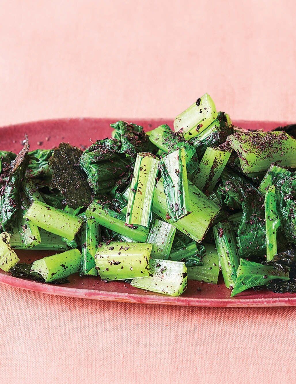 小松菜は塩少々を加えた湯で約1分ゆでて冷水にとり、水けをきって長さ3cmに切る。ゆかり小さじ1 1/2、ごま油を加えて混ぜ、ちぎった焼きのりを加えてあえる。器に盛り、ゆかり少々をふる。