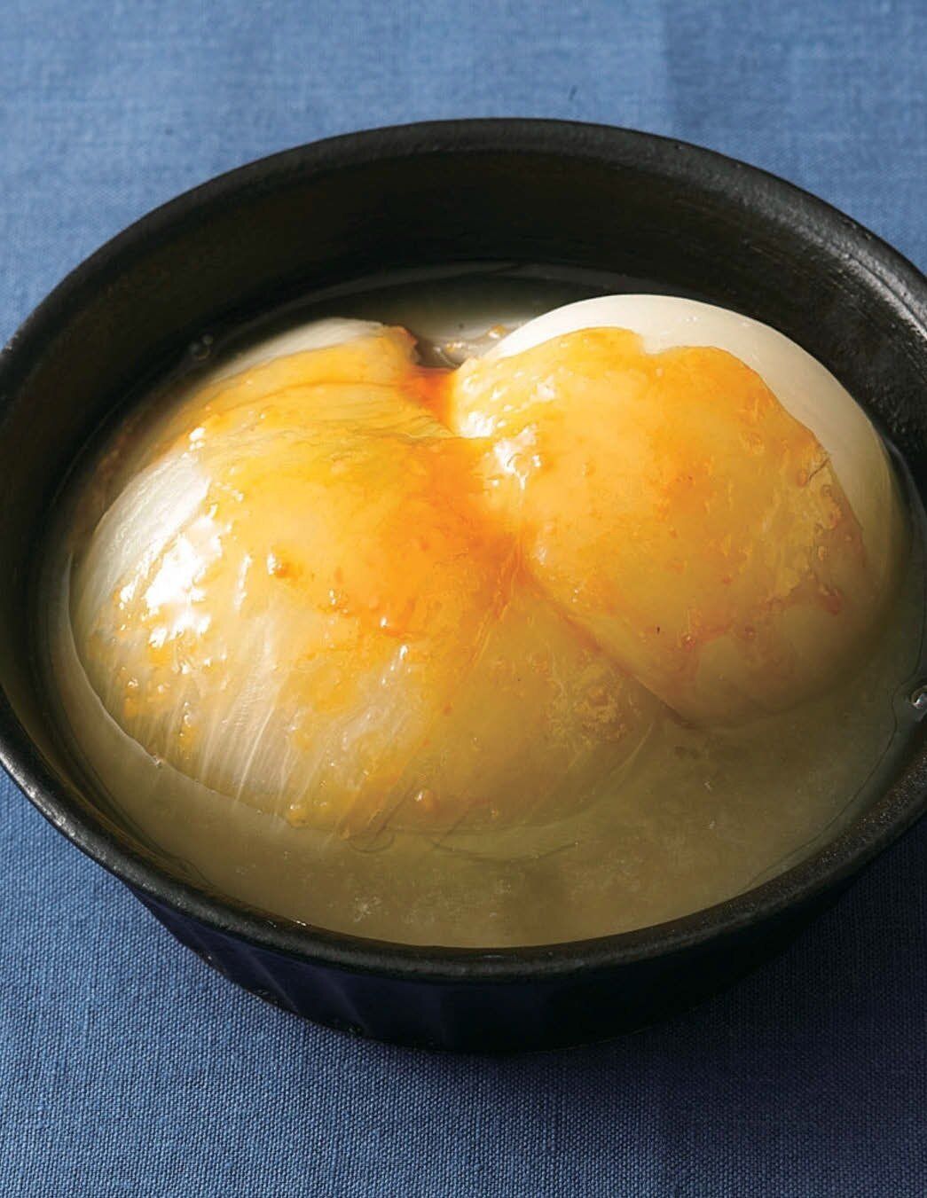 玉ねぎはしんをつけたまま縦6等分に切る。鍋に昆布、玉ねぎ、塩少々、たっぷりの水を入れて火にかけ、煮立ったら弱火で30~40分柔らかくなるまで煮る。小鍋にみそだれの材料を入れて混ぜ、弱火にかけてとろりとするまで練り混ぜる。器に煮汁とともに玉ねぎを盛り、みそだれをかける。