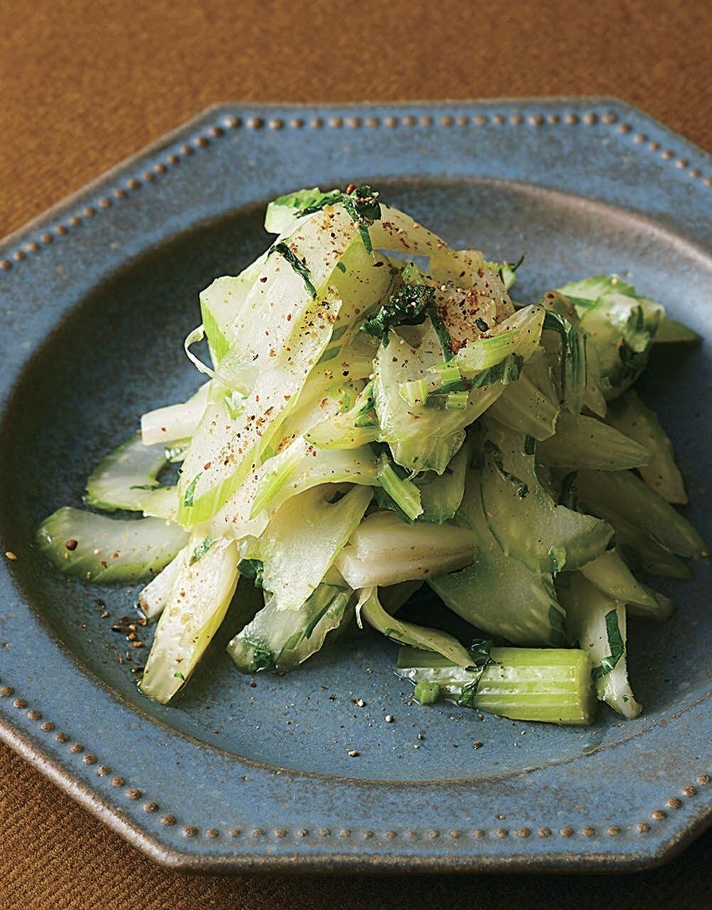 セロリは筋を取って斜め薄切りにする。葉は細切りにする。フライパンにごま油を中火で熱し、セロリの茎を入れてさっと炒める。油がなじんだら酒、塩小さじ1/2を加えて透き通るまで炒め、セロリの葉を加えて炒める。七味唐辛子をふる。